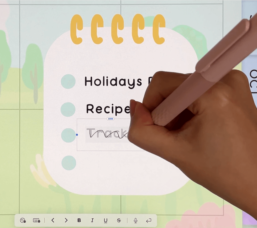 I’m using the iPad’s scribble function to write with text, and the reason is that the sticker itself is made from handwriting, so it will be harder to move or erase what you write if you also use handwriting on top. I love the scribble function, and if you make a mistake, you can put a squiggle through the words to erase them, which is really convenient.